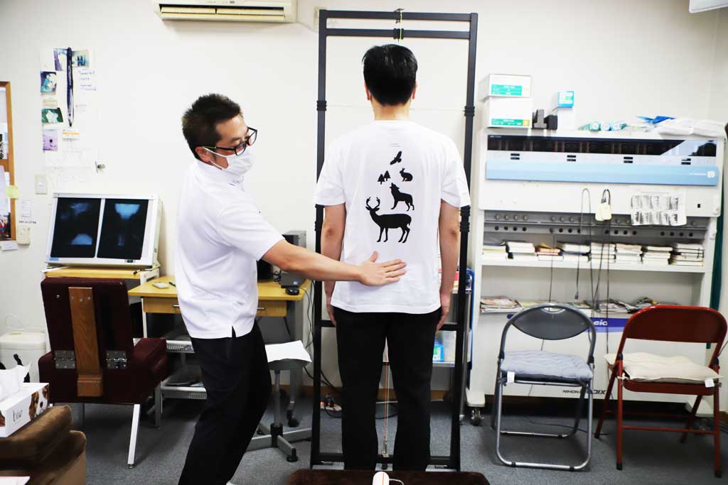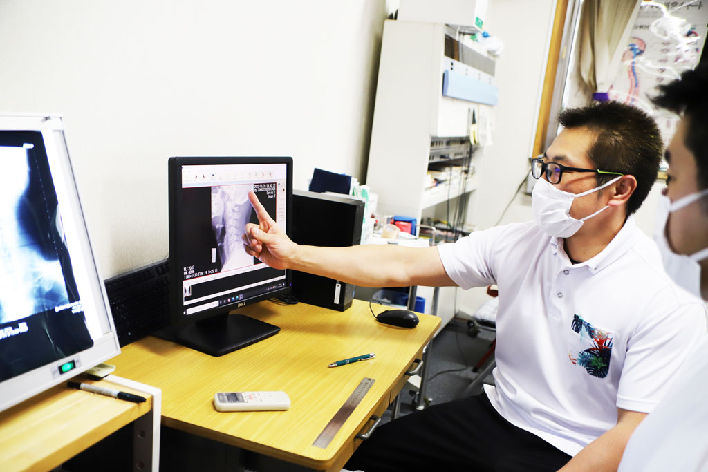 まず視診、触診や検査を行い、全体の体のバランスを見たり、どの骨がずれてどの神経を圧迫しているか、どのような症状の原因となっているかなどを詳しく調べます。